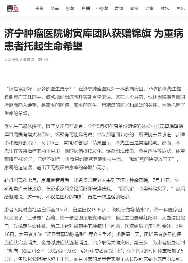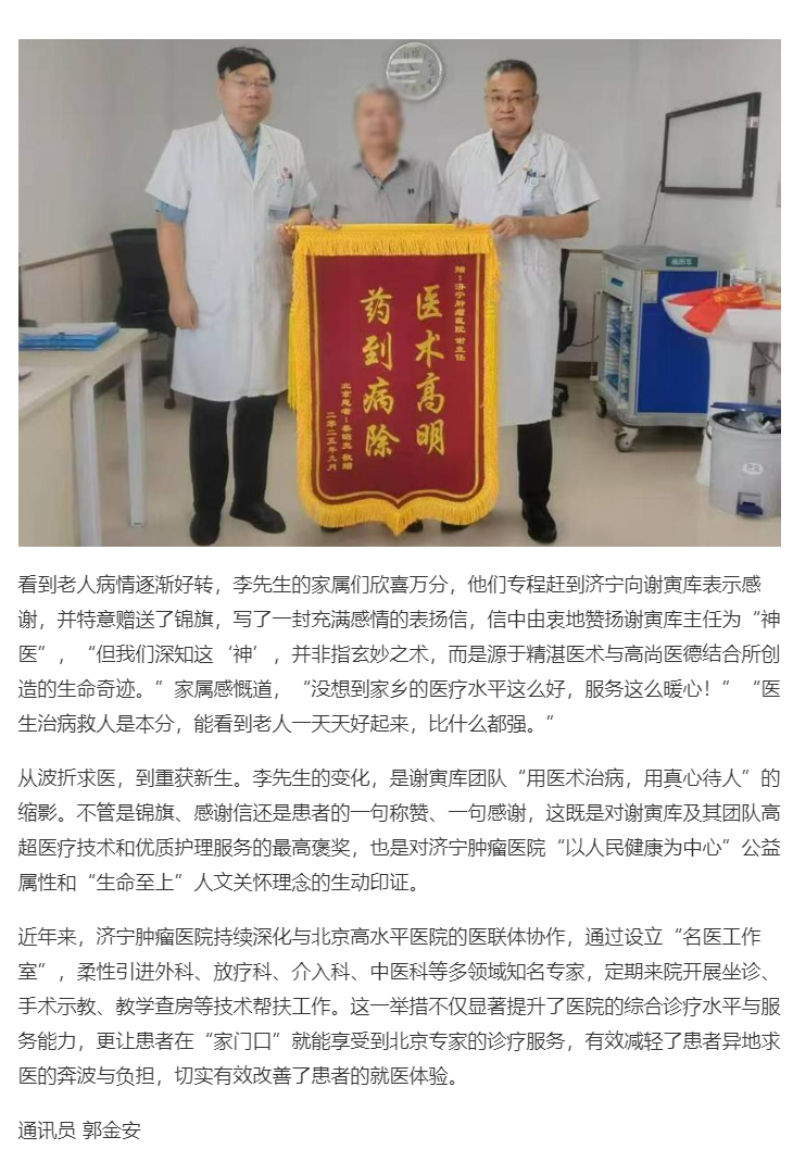 原鏈接:濟寧腫瘤醫(yī)院謝寅庫團隊獲贈錦旗 為重病患者托起生命希望